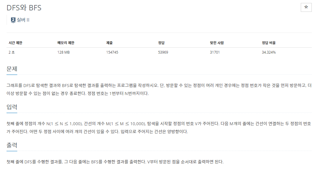 해당 문제는 DFS와 BFS의 기본개념을 이해하기 좋은문제이다. DFS는 재귀로 구현하는게 보통이고 BFS는 queue로 구현하는게 보통이다. 또한 입력받은 노드의 개수만큼 이차원 리스트로(이차원 리스트의 인덱스:각 노드, 해당인덱스의 값들: 노드들과 연결 여부) False로 초기화한다음 만약 연결되어 있다면 True로 바꿔주는 형식으로 구현해도 되고 혹은 정점만 입력 받아서 그 정점만 찾아나가는 방식으로 구현해도 된다. 단, 정점만 찾아나가는 방식으로 구현할 경우 낮은 숫자부터 탐색하라고 되어있으니 오름차순 정렬이 필요하다. queue는 리스트를 사용해도 되고 deque을 사용해도 되지만 popleft가 구현되어 있는 시간복잡도가 더 낮은 deque을 사용하는 것이 좋다.